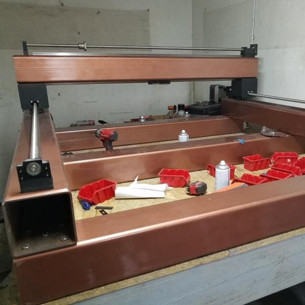 Cutting the steel faceplates for gantry rollers, spacers, installing rails and painting machine, and finally building the Z axis.