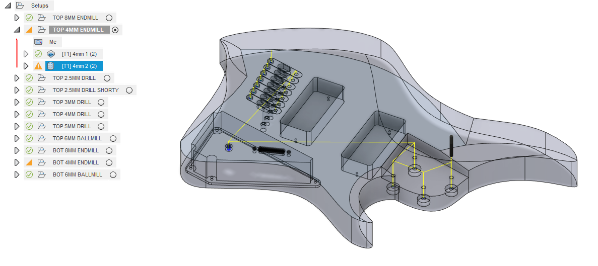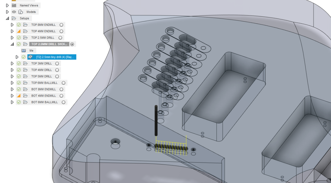 The most challenging feature to figure out how to cut was the 2.5mm wide slot in the face of the guitar. I ended up adding a sketch over this slot with equally spaced lines to make it easy to place a drilling operation at each intersection.