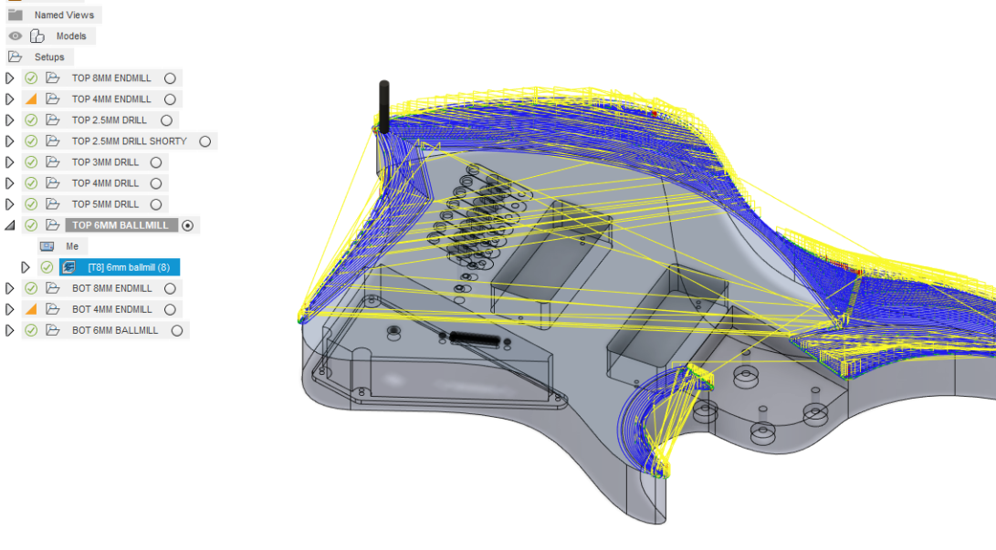 On future guitars, I think our plan would be to first mesh model the guitar, and then use sketches to cut features specific to elements that require precise positioning (neck/pickups/bridge/etc) afterwards. It offers a bit more creative freedom without sacrificing the ability to make a model that can be used for CAM.