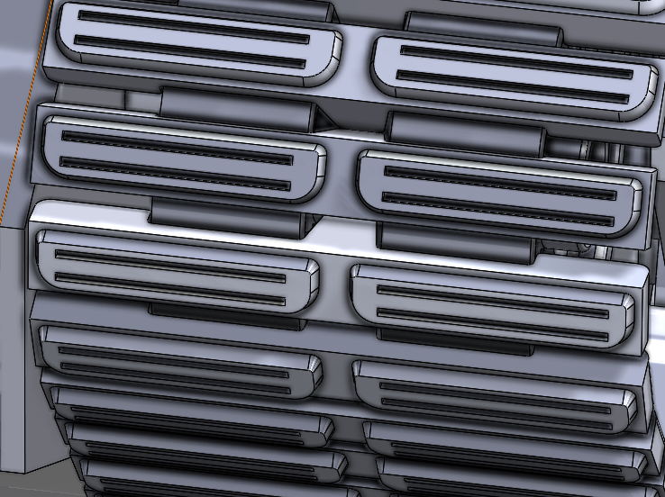 I designed the track feet with four 1.75mm gaps in them, either to potentially grab the ground a bit better on dirt or to press-fit TPU 3D printing filament into them. However, after realizing how many track feet that I needed and how much time it would take to cut and press in that many pieces of TPU, I abandoned the idea for now. Luckily, it isn't really an issue as the feet are already grabby enough on the ground without the TPU inserts.